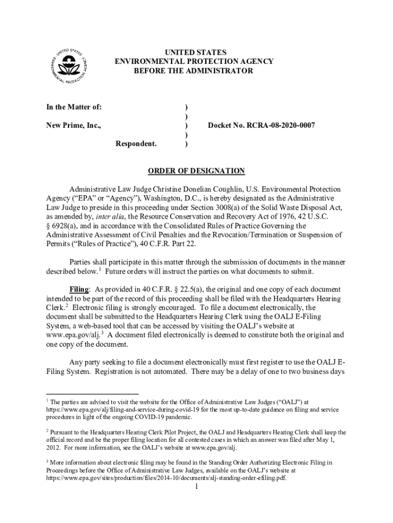 UNITED STATES ENVIRONMENTAL PROTECTION AGENCY BEFORE THE ADMINISTRATOR In the Matter of: New Prime, Inc., Respondent.) ))))Docket No. RCRA0820200007ORDER OF DESIGNATION Administrative Law Judge Christine
