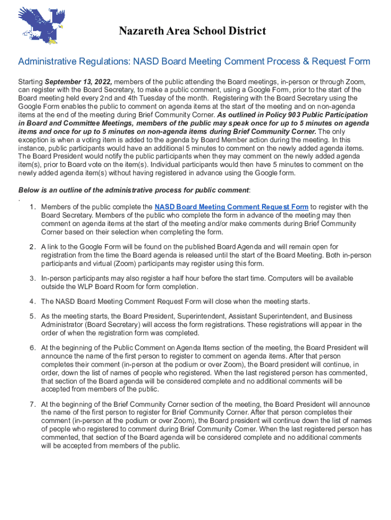 Nazareth Area School District Administrative Regulations: NASA Board Meeting Comment Process & Request Form Starting September 13, 2022, members of the public attending the Board meetings, unperson