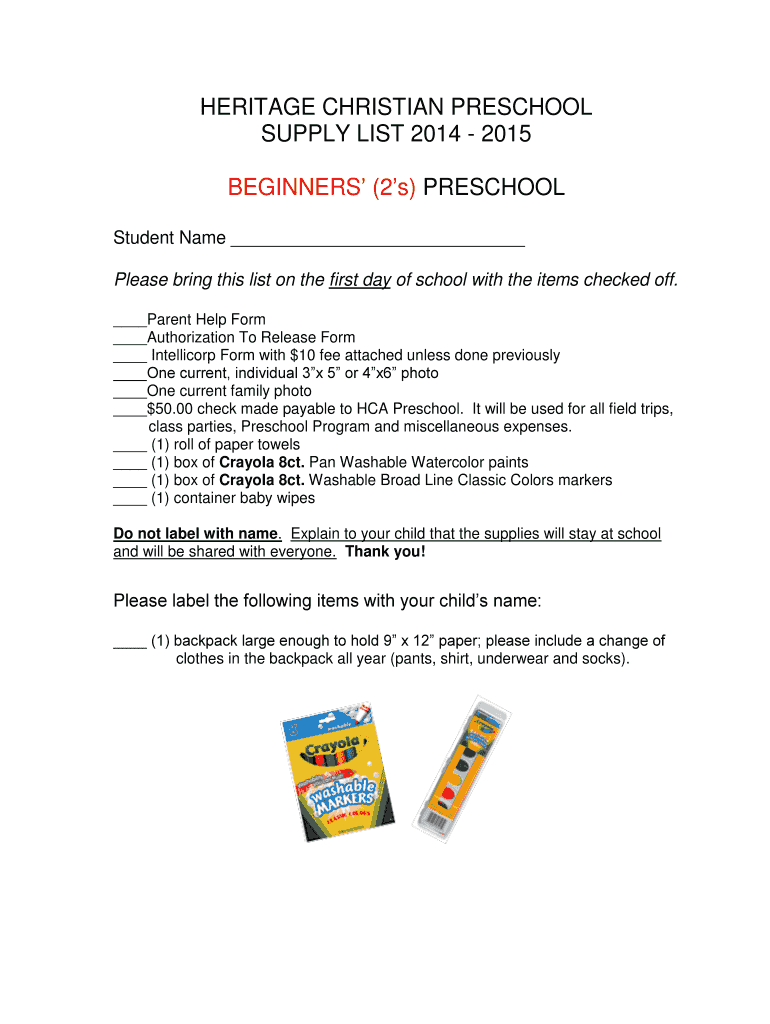 HERITAGE CHRISTIAN PRESCHOOL SUPPLY LIST 2014 2015 BEGINNERS (2 s) PRESCHOOL Student Name Please bring this list on the first day of school with the items checked off. Parent Help Form Authorization