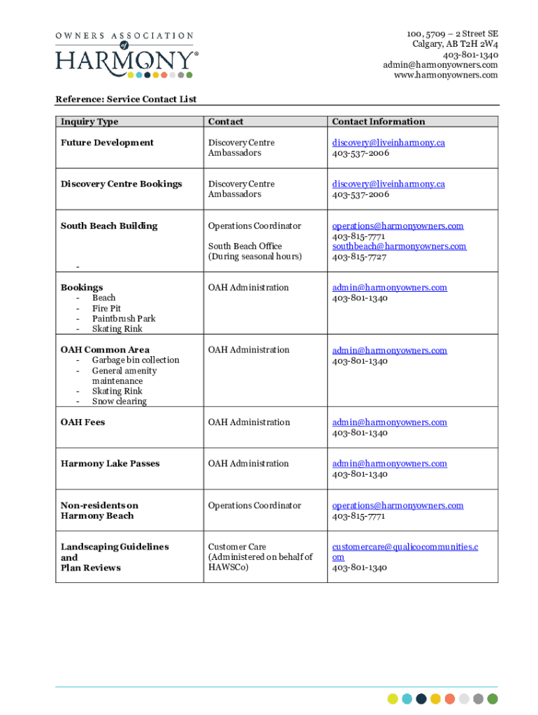 100, 5709 2 Street SE Calgary, AB T2H 2W4 4038011340 admin@harmonyowners.com www.harmonyowners.com Reference: Service Contact List Inquiry TypeContactContact InformationFuture DevelopmentDiscovery