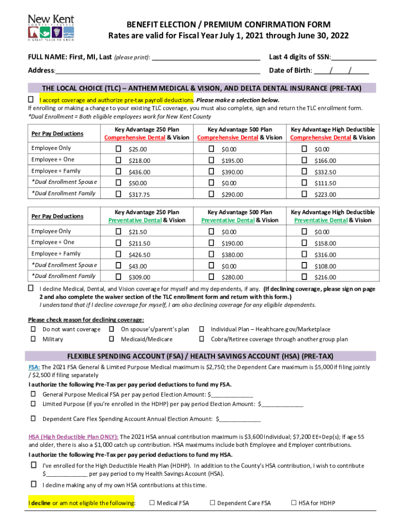 Get the free BENEFIT ELECTION / PREMIUM CONFIRMATION FORM Rates are ...