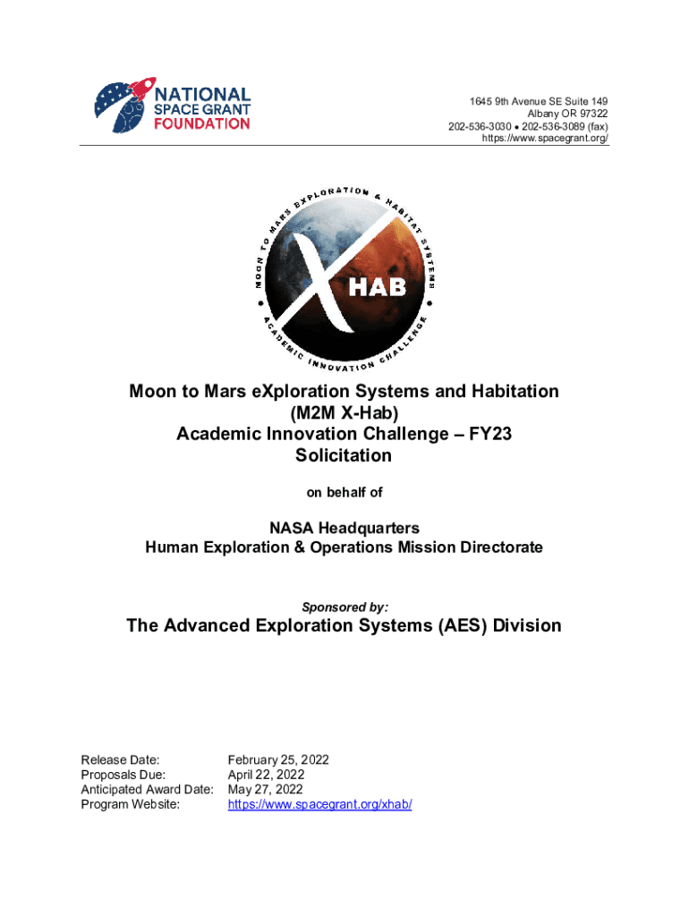 1645 9th Avenue SE Suite 149 Albany OR 97322 2025363030 2025363089 (fax) https://www.spacegrant.org/Moon to Mars exploration Systems and Habitation (M2M Ahab) Academic Innovation Challenge FY23 Solicitation