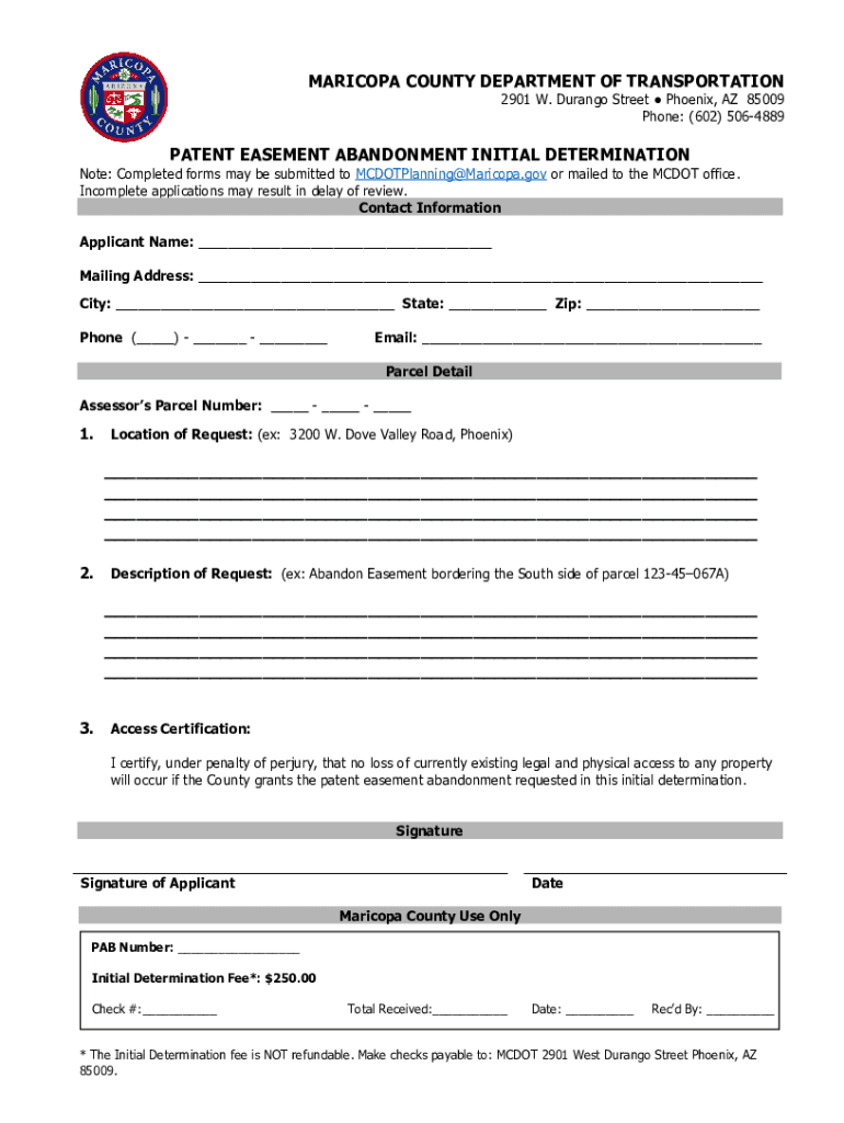 MARICOPA COUNTY DEPARTMENT OF TRANSPORTATION 2901 W. Durango Street Phoenix, AZ 85009 Phone: (602) 5064889PATENT EASEMENT ABANDONMENT INITIAL DETERMINATIONNote: Completed forms may be submitted to