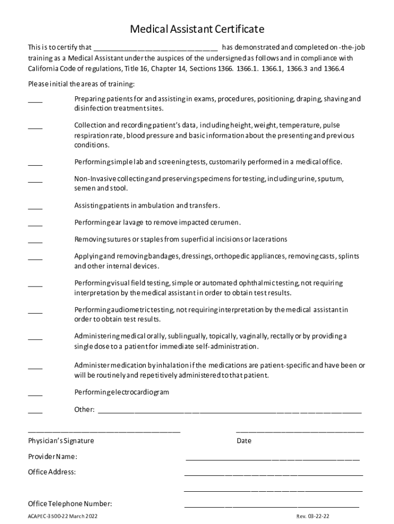 Medical Assistant Certificate This is to certify that ___ has demonstrated and completed onthejob training as a Medical Assistant under the auspices of the undersigned as follows and in compliance