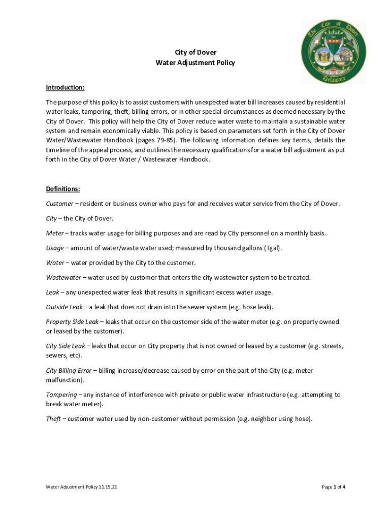 City of Dover Water Adjustment Policy Introduction: The purpose of this policy is to assist customers with unexpected water bill increases caused by residential water leaks, tampering, theft, billing