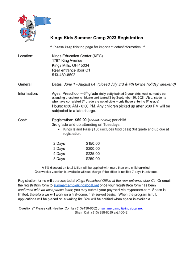 Kings Kids Summer Camp 2023 Registration ** Please keep this top page for important dates/information. **Location:Kings Education Center (KEY) 1797 King Avenue Kings Mills, OH 45034 Rear entrance