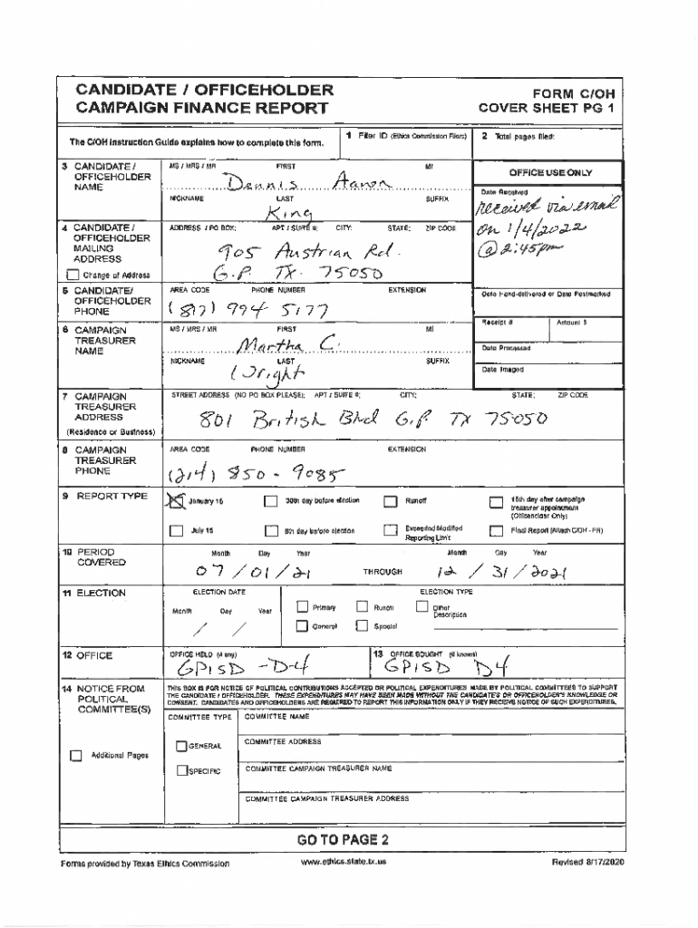 CANDIDATE / OFFICEHOLDER CAMPAIGN FINANCE REPORTER C/OH COVER SHEET PG 1The C/OH instruction Guide explains how to complete this form. 3 CANDIDATE/ OFFICEHOLDER NAMES I MRS I MR\'FIRSTLASTkc6 CAMPAIGN