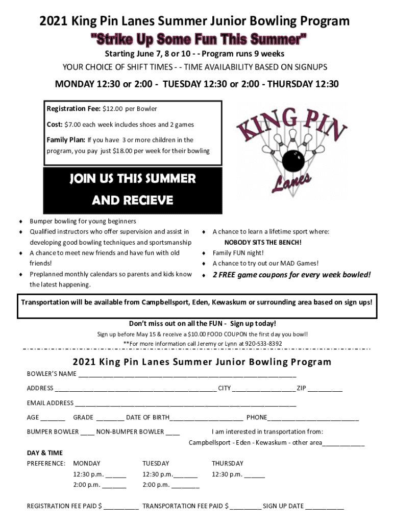 2021 King Pin Lanes Summer Junior Bowling Program Starting June 7, 8 or 10 Program runs 9 weeks YOUR CHOICE OF SHIFT TIMES TIME AVAILABILITY BASED ON SIGNUPSMONDAY 12:30 or 2:00 TUESDAY 12:30 or 2:00
