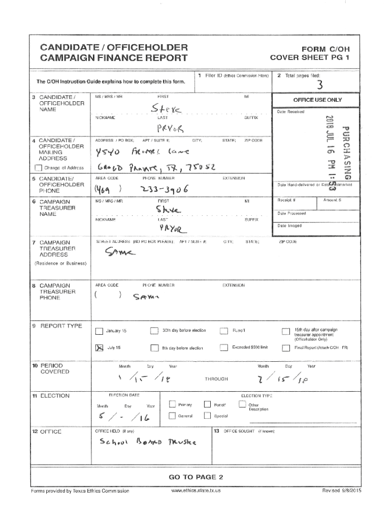 CANDIDATE/ OFFICEHOLDER CAMPAIGN FINANCE REPORTER C/OH COVER SHEET PG 1 Filer ID Ethics Commission Filers)12Total pages filed:The C/OH Instruction Guide explains how to complete this form.CANDIDATE/