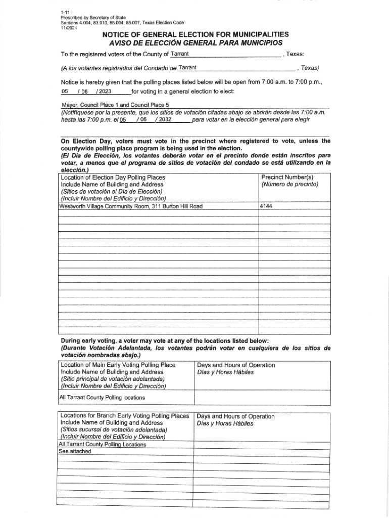 111Prescribed by Secretary of State Sections 4.004, 83.010, 85.004, 85.007, Texas Election Code 11t2021NOTICE OF GENERAL ELECTION FOR MUNICIPALITIES AVIS ODE ELECCI6N TUNNEL PARA MUNICIPALS To the