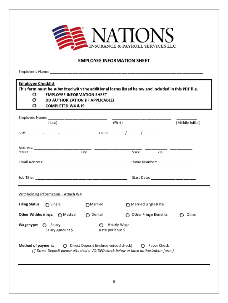 EMPLOYEEINFORMATIONSHEET EmployersName:___ EmployeeChecklist ThisformmustbesubmittedwiththeadditionalformslistedbelowandincludedinthisPDFfile. EMPLOYEEINFORMATIONSHEET AUTHORIZATION(INAPPLICABLE)