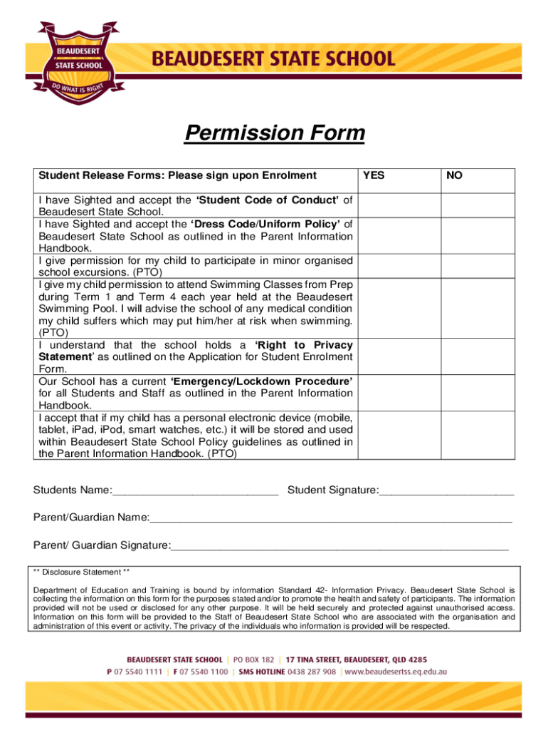Permission Form Student Release Forms: Please sign upon EnrolmentYESNOI have Sighted and accept the Student Code of Conduct of Beau desert State School. I have Sighted and accept the Dress Code/Uniform