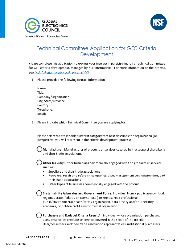 Get the free Technical Committee Application for GEC Criteria - standards nsf