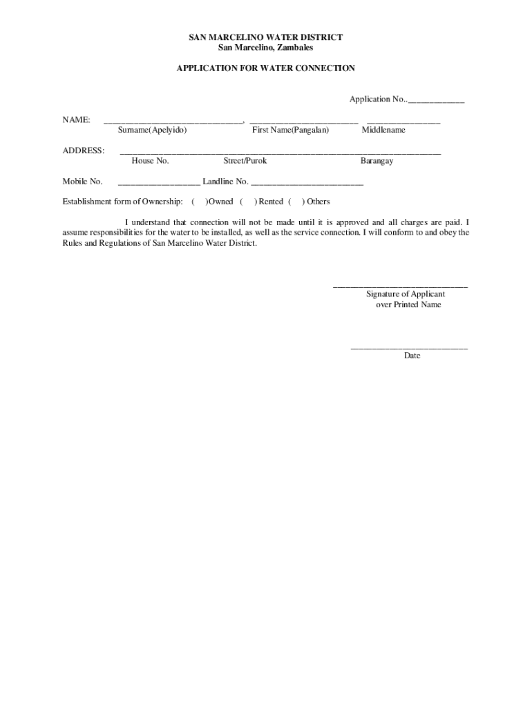 SAN MARCELINO WATER DISTRICT San Marcelino, Gambles APPLICATION FOR WATER CONNECTIONApplication No.___ NAME:___, ___ ___ Surname(Adelaide) First Name(Angolan) MiddlenameADDRESS:___ House No. Street/Park