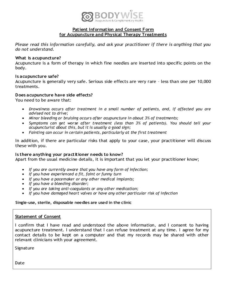 Patient Information and Consent Form for Acupuncture and Physical Therapy Treatments Please read this information carefully, and ask your practitioner if there is anything that you do not understand.