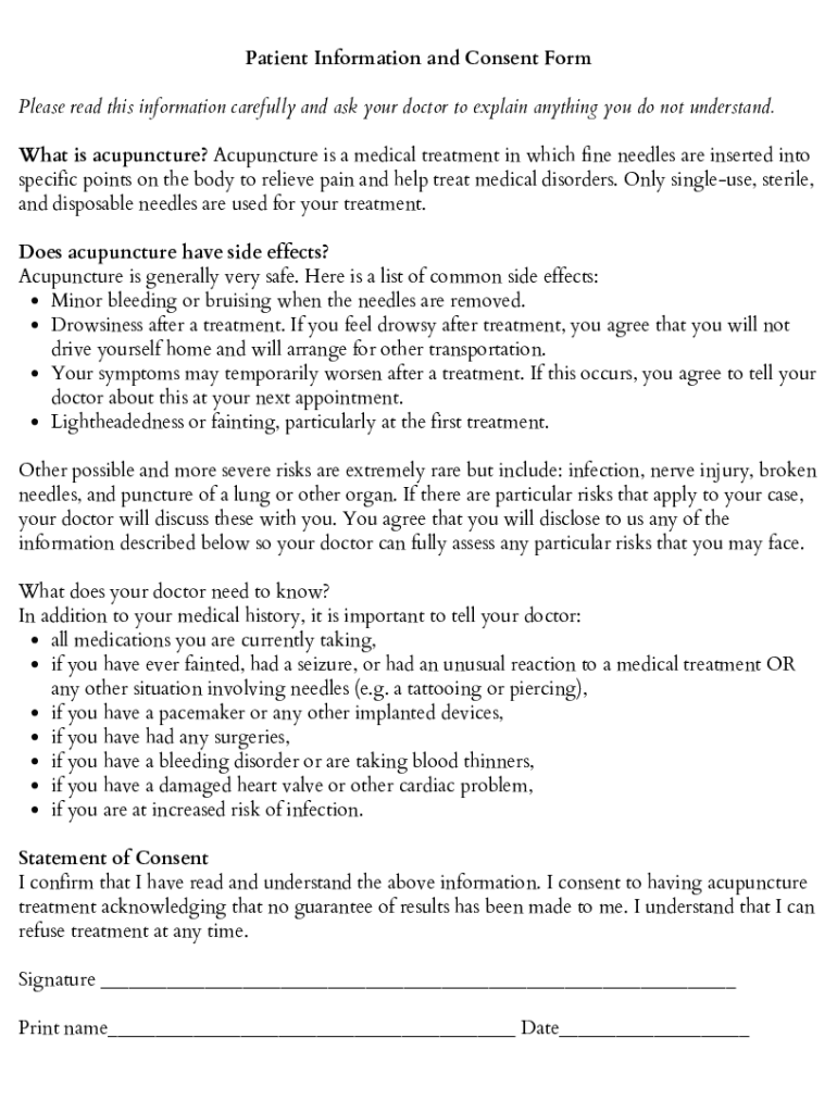 Patient Information and Consent Form Please read this information carefully and ask your doctor to explain anything you do not understand. What is acupuncture? Acupuncture is a medical treatment in