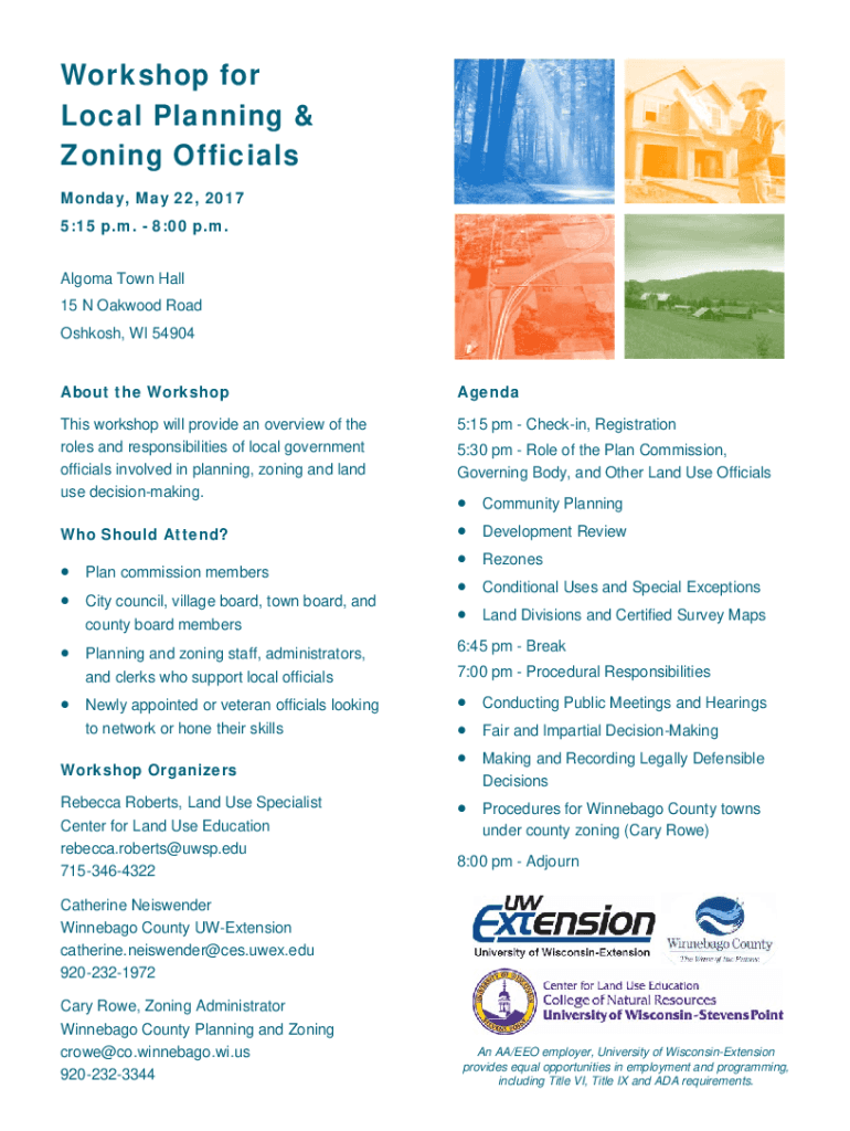 Workshop for Local Planning & Zoning Officials Monday, May 22, 2017 5:15 p.m. 8:00 p.m. Alma Town Hall 15 N Oak wood Road Oshkosh, WI 54904 About the WorkshopAgendaThis workshop will provide an overview
