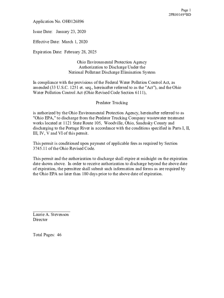 Page 1 2PR00149×Application No. OH0126896 Issue Date: January 23, 2020, Effective Date: March 1, 2020, Expiration Date: February 28, 2025 Ohio Environmental Protection Agency Authorization to Discharge