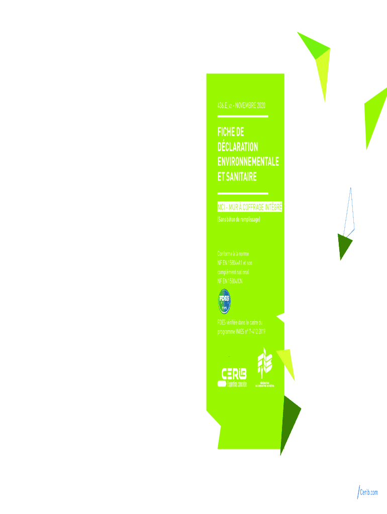 FDES-MCI-Mur-à-coffrage-intégré-sans-béton-de est une fiche de déclaration environnementale et sanitaire pour un mur construit avec un coffrage intégré sans béton.