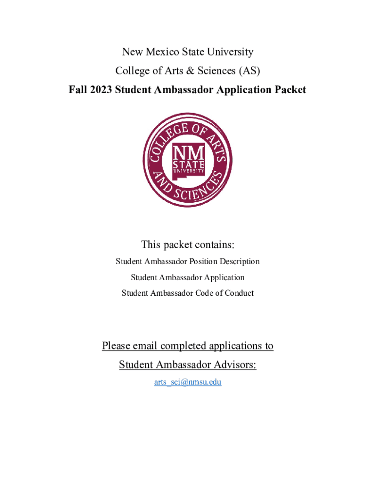 New Mexico State University College of Arts & Sciences (AS) Fall 2023 Student Ambassador Application Packets packet contains: Student Ambassador Position Description Student Ambassador Application
