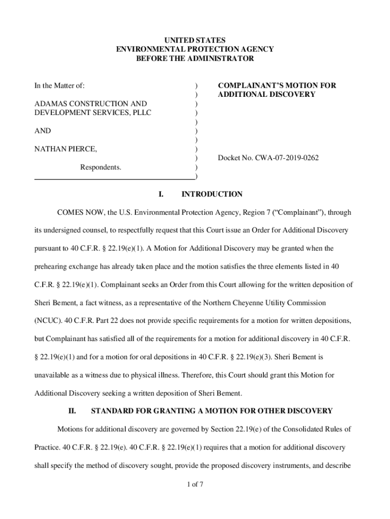 UNITED STATES ENVIRONMENTAL PROTECTION AGENCY BEFORE THE ADMINISTRATOR In the Matter of:)))))))))))ADAMS CONSTRUCTION AND DEVELOPMENT SERVICES, LLC AND NATHAN PIERCE, Respondents. I.COMPLAINANTS MOTION
