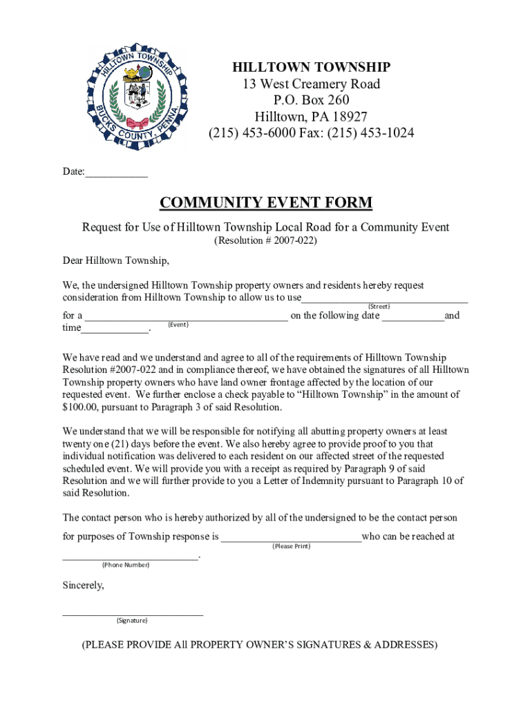 Get the free COMMUNITY EVENT FORM - Hilltown Township
