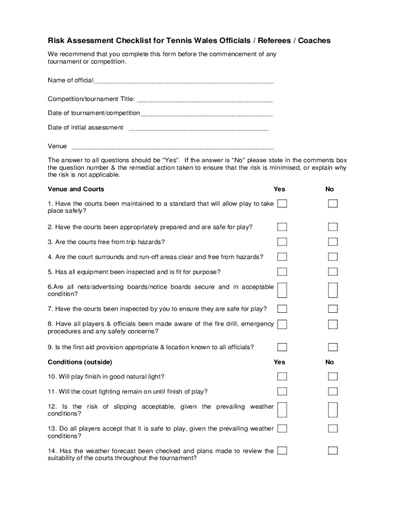 Get the free Risk Assessment Checklist for Tennis Wales Officials / ...