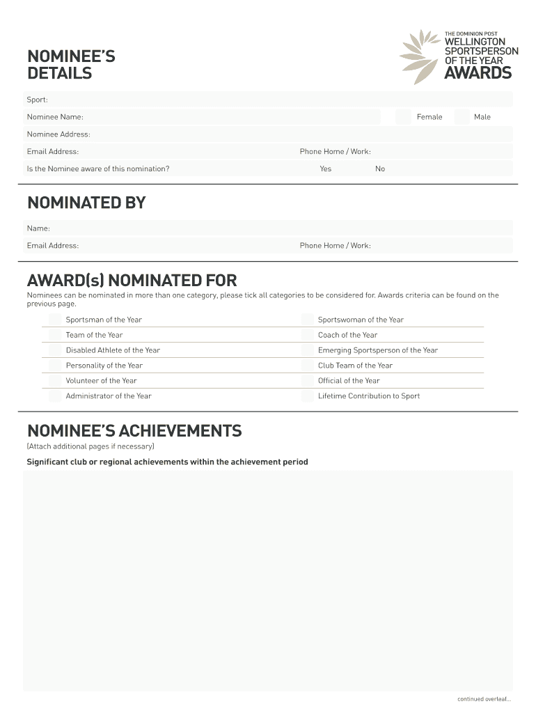 Anyone who wishes to nominate individuals or teams for sports-related awards, recognition, or programs organized by Sport Wellington is required to file the nomination form.