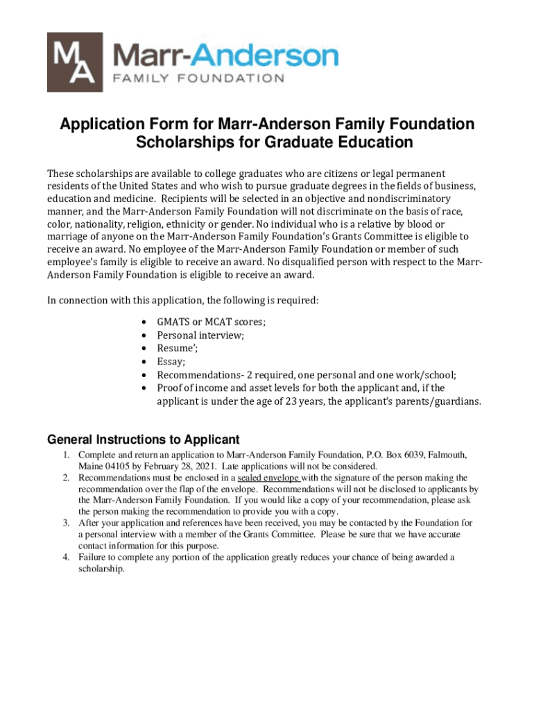 Application Form for MarrAnderson Family Foundation Scholarships for Graduate from Education These scholarships are available to college graduates who are citizens or legal permanent residents of