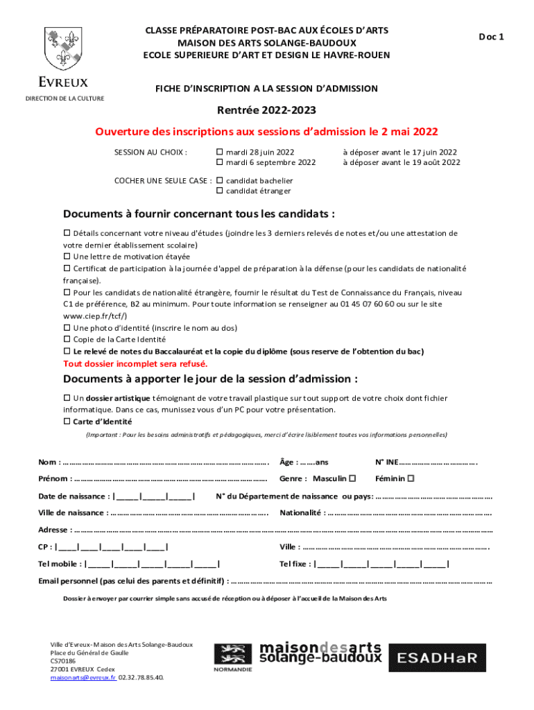 COLE SUPERIOR DART ET DESIGN LE HAVREROUENDoc 1FICHE INSCRIPTION À la SESSION ADMISSION