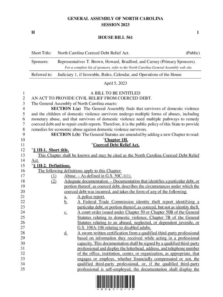 GENERAL ASSEMBLY OF NORTH CAROLINA SESSION 2023 H₁ HOUSE BILL 561Short Title:North Carolina Coerced Debt Relief Act.(Public)Sponsors:Representatives T. Brown, Howard, Bradford, and Carney (Primary
