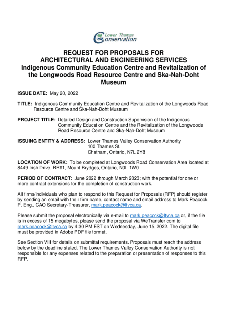 REQUEST FOR PROPOSALS FOR ARCHITECTURAL AND ENGINEERING SERVICES Indigenous Community Education Center and Revitalization of the Long woods Road Resource Center and SkaNahDoht Museum ISSUE DATE: May
