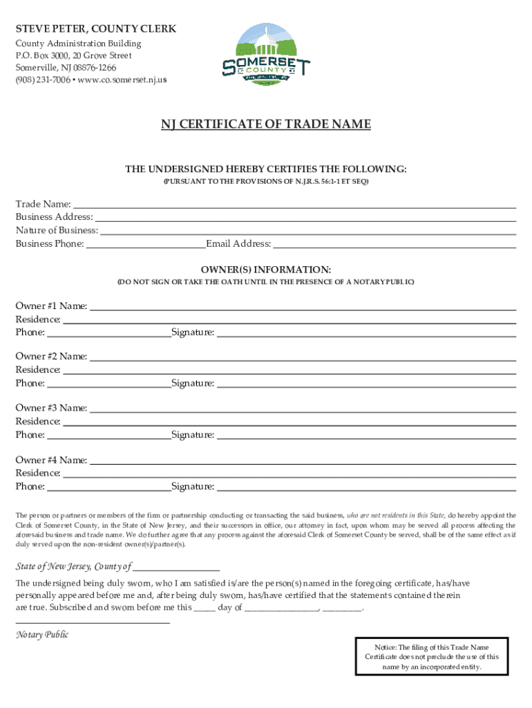 STEVE PETER, COUNTY CLERK County Administration Building P.O. Box 3000, 20 Grove Street Somerville, NJ 088761266 (908) 2317006 www.co.somerset.nj.usNJ CERTIFICATE OF TRADE NAME THE UNDERSIGNED HEREBY