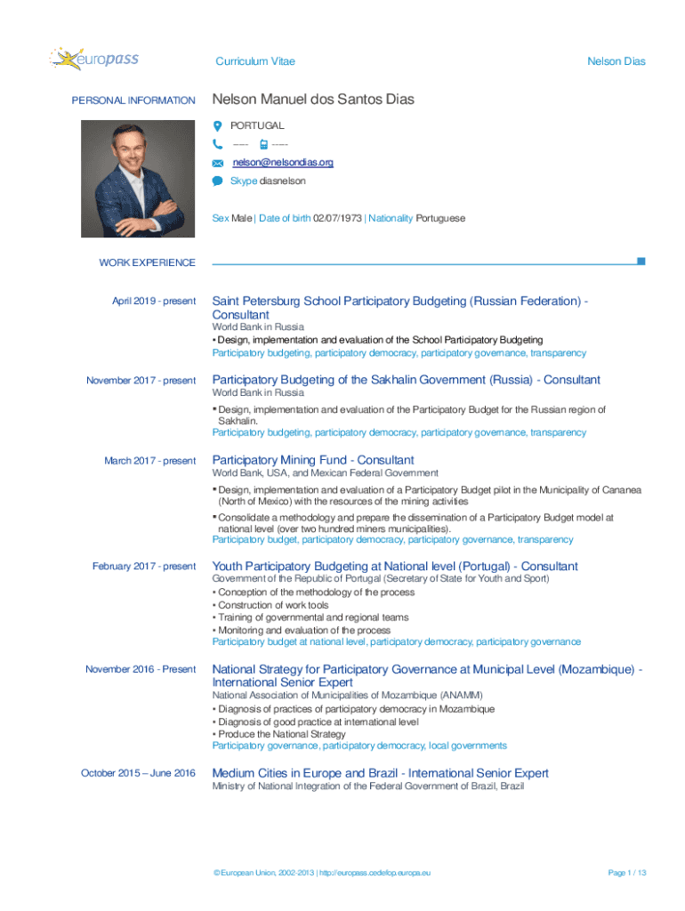 Get the free Europass CV - Curriculum Vitae Nelson Dias - Oficina