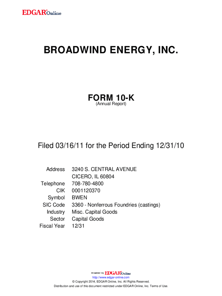 Get the free BROADWIND ENERGY, INC.. FORM 10-K (Annual Report) Filed 03/16/11 for the Period Endi...
