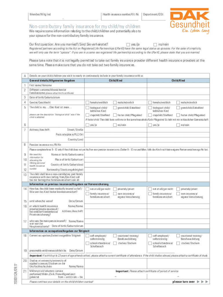 Member/MitgliedHealth insurance number/KV. NR., Department/Noncontributory family insurance for my child/my children require some information relating to the child/children and potentially also to