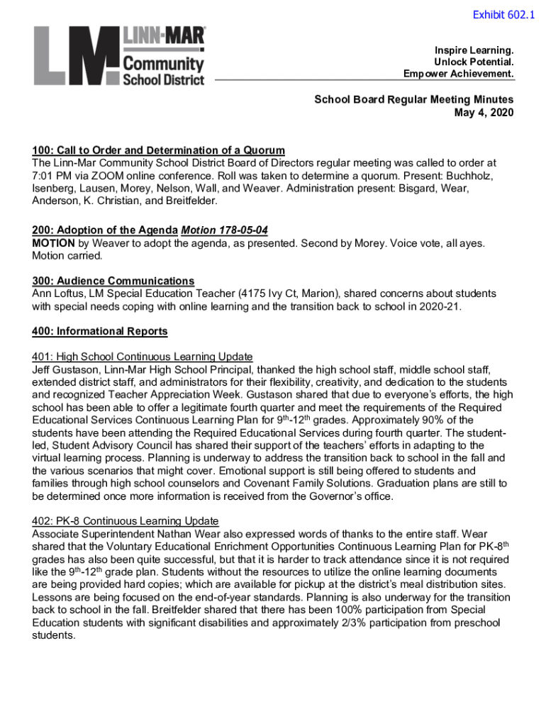 Exhibit 602.1 Inspire Learning. Unlock Potential. Empower Achievement. School Board Regular Meeting Minutes May 4, 2020 100: Call to Order and Determination of a Quorum The Linear Community School