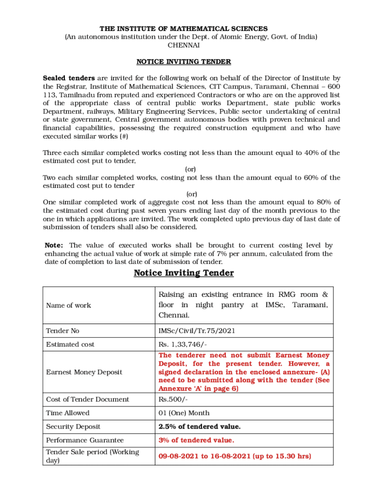 Get the free Notice Inviting Tender No: IMSc/Civil/e-Tr-01/2022