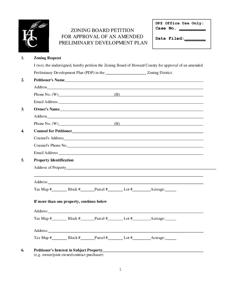 DMZ Office Use Only:ZONING BOARD PETITION FOR APPROVAL OF AN AMENDED PRELIMINARY DEVELOPMENT PLAN 1. Case No. ___ Date Filed:___Zoning Request I (we), the undersigned, hereby petition the Zoning Board