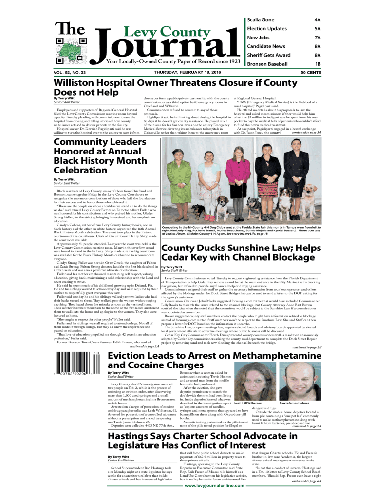 Journal Levy Contour LocallyOwned County Paper of Record since 1923VOL. 92, NO. 33Scalia Gone4AElection Updates5ANew Jobs7ACandidate News8ASheriff Gets Award8ABronson Baseball1BTHURSDAY, FEBRUARY