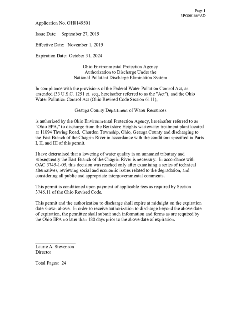 Page 1 3PG00166×Application No. OH0149501 Issue Date:September 27, 2019Effective Date: November 1, 2019, Expiration Date: October 31, 2024 Ohio Environmental Protection Agency Authorization to Discharge