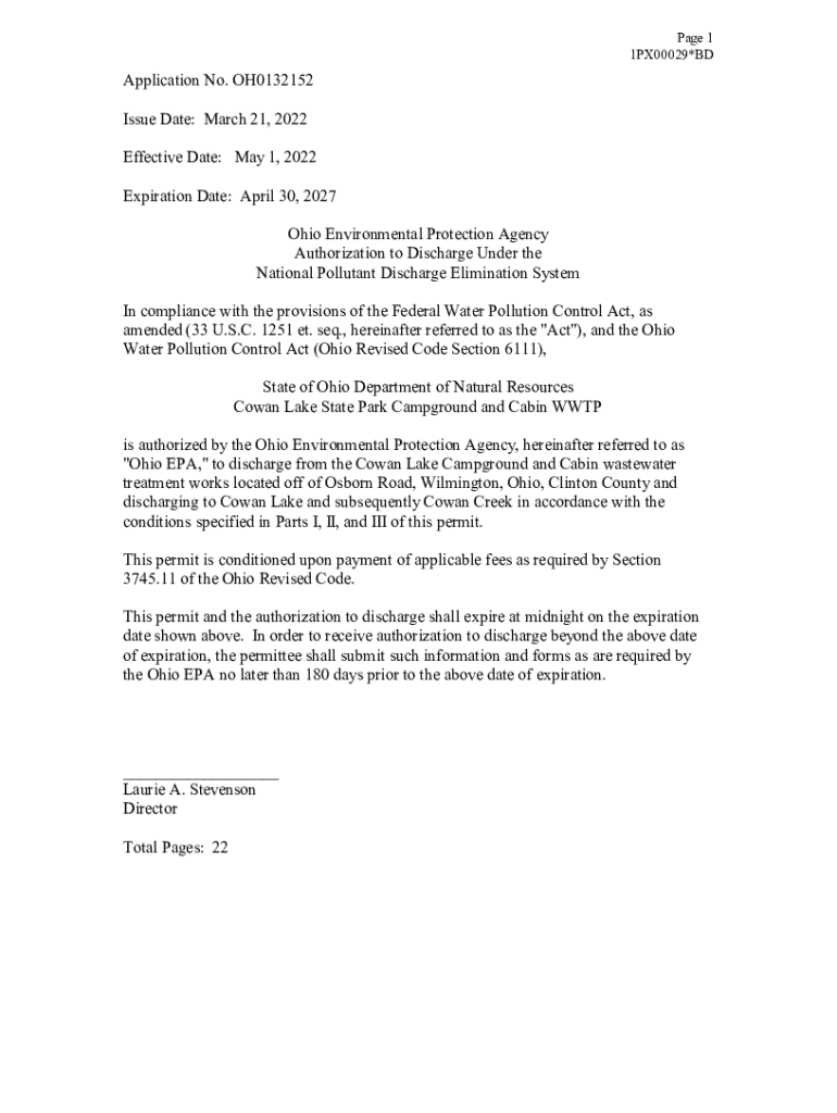 Page 1 1PX00029×Application No. OH0132152 Issue Date: March 21, 2022, Effective Date: May 1, 2022, Expiration Date: April 30, 2027 Ohio Environmental Protection Agency Authorization to Discharge