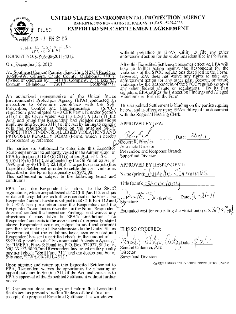 UNITED STATES ENVIRONMENTAL PROTECTION AGENCY REGION 6, 1445 ROSS AVENUE, DALLAS, TEXAS 752022733EXPEDITED SI)CC SETTLEMENT AGREEMENT2: 05 DOCKET NO. CWA0620114312 On: December 15, 2010, At: Southeast