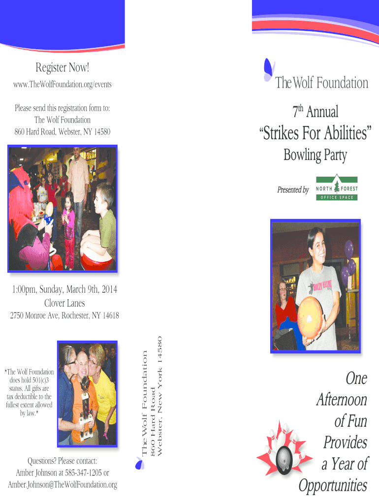 Register Now! www.TheWolfFoundation.org/events 7th Annual Please send this registration form to: The Wolf Foundation 860 Hard Road, Webster, NY 14580 Strikes For Abilities Bowling Party Presented