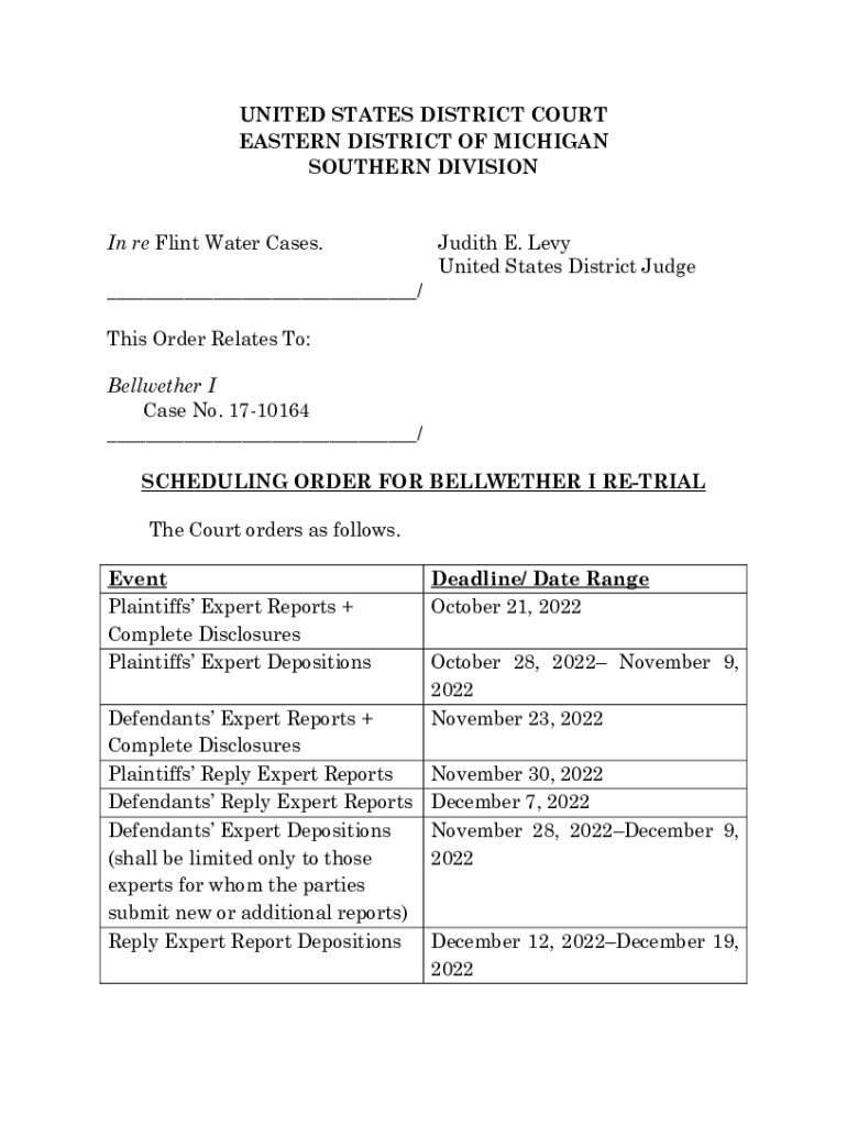UNITED STATES DISTRICT COURT EASTERN DISTRICT OF MICHIGAN SOUTHERN DIVISION In re Flint Water Cases. Judith E. Levy United States District Judge___/ This Order Relates To: Bellwether I Case No. 1710164