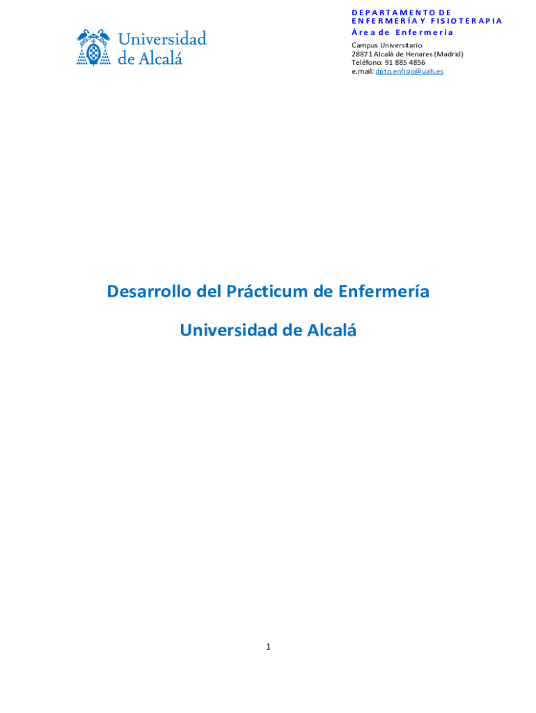 DEPARTMENT DE ENFORCER Y FISIOTERAPIA REA de Enforcer Campus Universitario 28871 Algal de Hen ares (Madrid) Teflon: 91 885 4856 e.mail: dpto.enfisio@uah.esDesarrollo Del Practicum de Enfermera Universidad