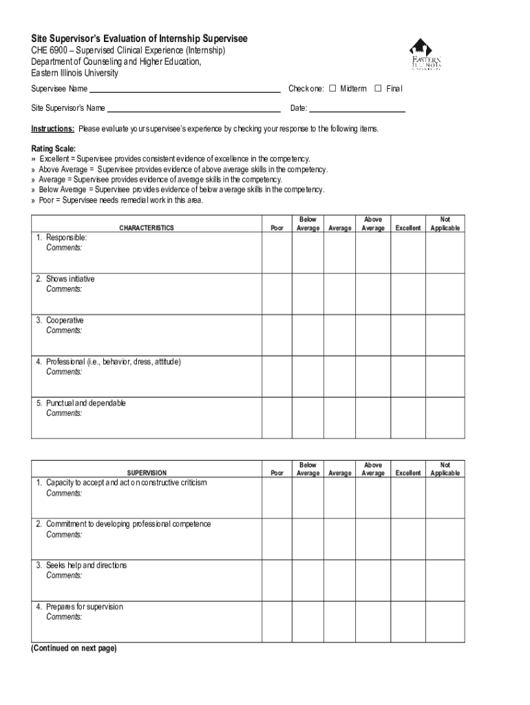 Site Supervisors Evaluation of Internship Supervised CHE 6900 Supervised Clinical Experience (Internship) Department of Counseling and Higher Education, Eastern Illinois University Supervised Namecheap