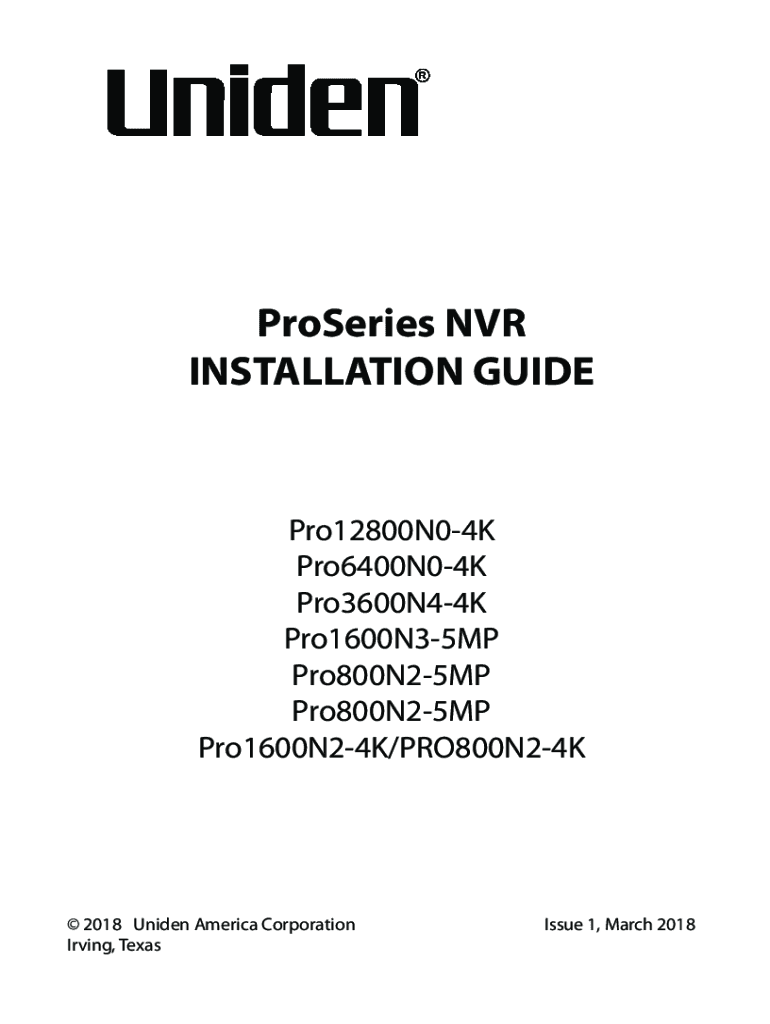 Properties NVR INSTALLATION GUIDEPro12800N04K Pro6400N04K Pro3600N44K Pro1600N35MP Pro800N25MP Pro1600N24K/PRO800N24K 2018 Uniden America Corporation Irving, TexasIssue 1, March 2018 2018 Uniden America
