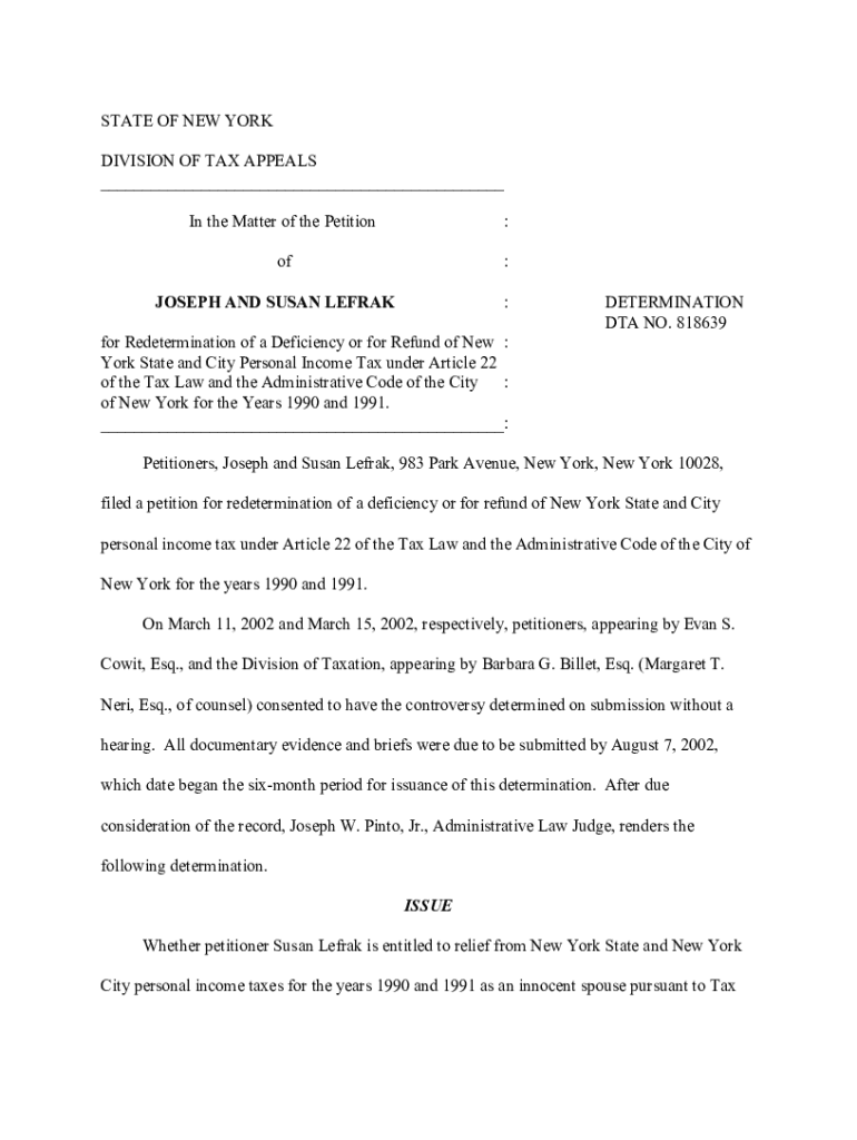STATE OF NEW YORK DIVISION OF TAX APPEALS ___ In the Matter of the Petition:of:JOSEPH AND SUSAN LEAK:DETERMINATION DTA NO. 818639for Redetermination of a Deficiency or for Refund of New : York State