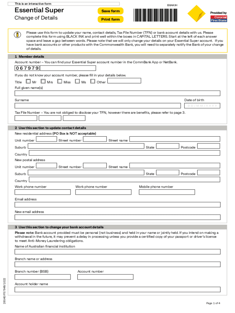 This is an interactive formB8AKIHEssential Super Save shortchange of DetailsPrint formulas use this form to update your name, contact details, Tax File Number (TEN) or bank account details with us.